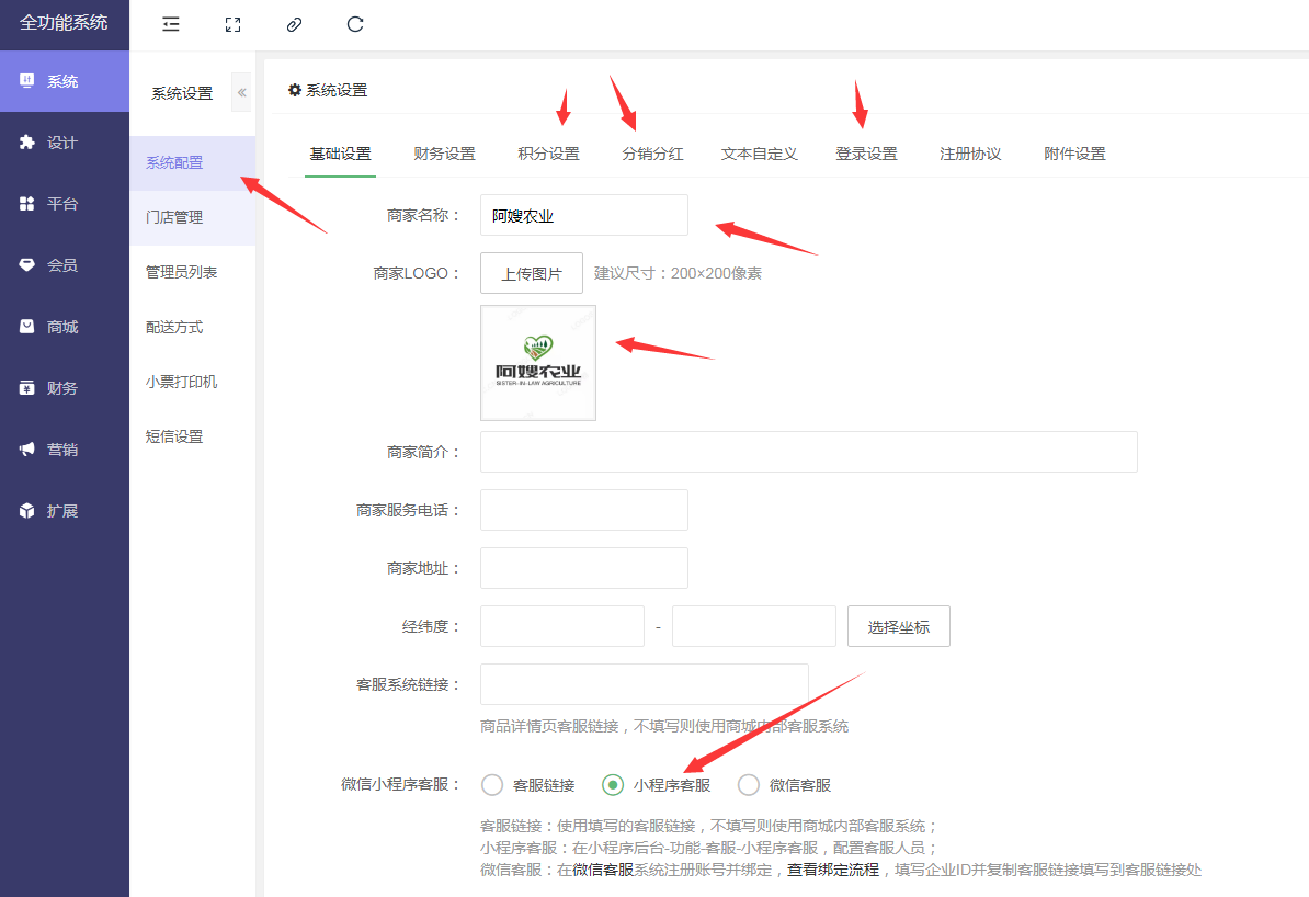 系統設置,可以設置名稱,LOGO和相關信息,可以把自己需要的積分規則,分銷,登錄等設置好
