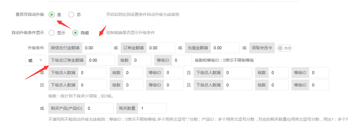 如果有多個會員等級,可以設置自動升級的條件,比如消費滿多少,下級消費滿多少,或者拉了多少個哪個等級的下級,才能自動升級
